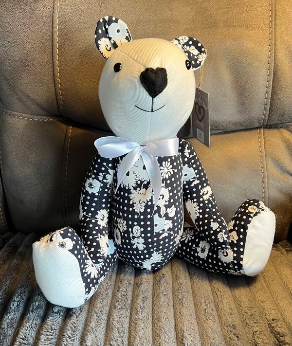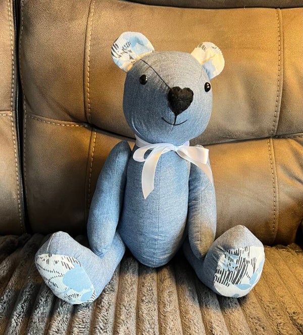 This is the most popular of our memory bears. The "Charlie Bear" pattern by Rachel Leggett (Cwtch Patterns) creates a memory bear about 35cm (13.5 inches) tall and 30cm (11.5 inches) wide,